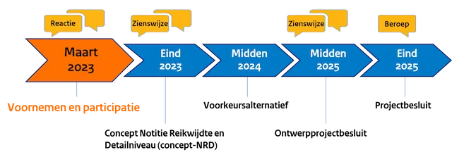 In dit document staat een uitgebreide projectbeschrijving en wordt duidelijk welke tracé-alternatieven en -varianten en milieuaspecten we gaan onderzoeken in ons Milieueffectrapport (MER). De concept-NRD wordt naar verwachting begin november 2023 ter inzage gelegd. In deze periode organiseren we ook weer informatiebijeenkomsten om u bij te praten en zorgen we dat er voldoende mogelijkheden zijn om mee te denken met de plannen. Iedereen, dus u ook, kan gedurende zes weken na publicatie een reactie indienen. Meer informatie hierover ontvangt u na de zomer. Hieronder ziet u de globale projectplanning.