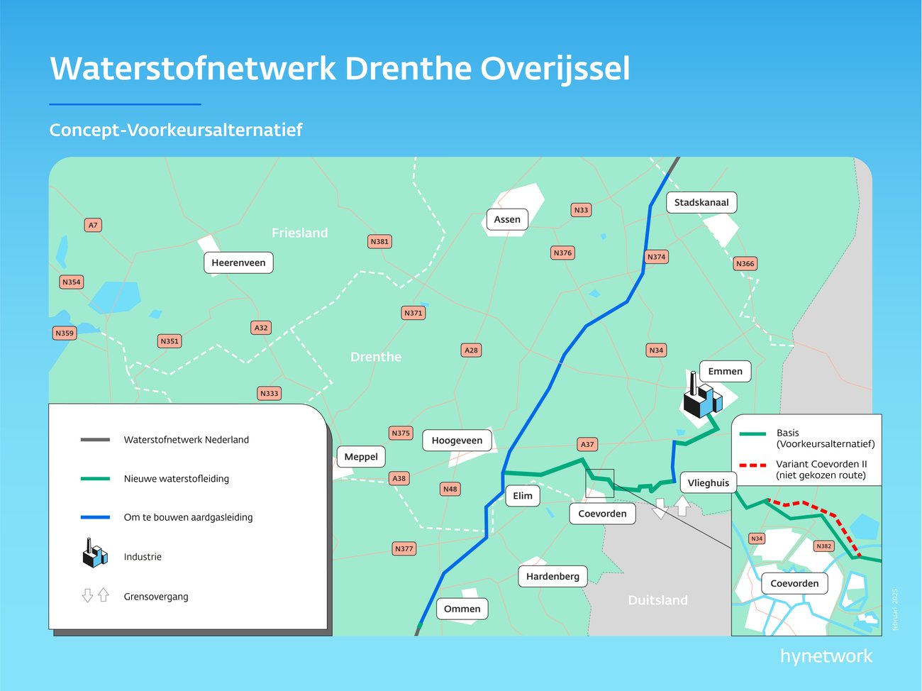 Voor het waterstofnetwerk maken we voor het grootste gedeelte gebruik van bestaande aardgasleidingen. Die komen beschikbaar omdat er in de komende jaren steeds minder transport van aardgas zal zijn. Ook in Drenthe en Overijssel bestaat een groot gedeelte van het waterstofnetwerk uit pijpleidingen die nu nog worden gebruikt voor het transport van aardgas.