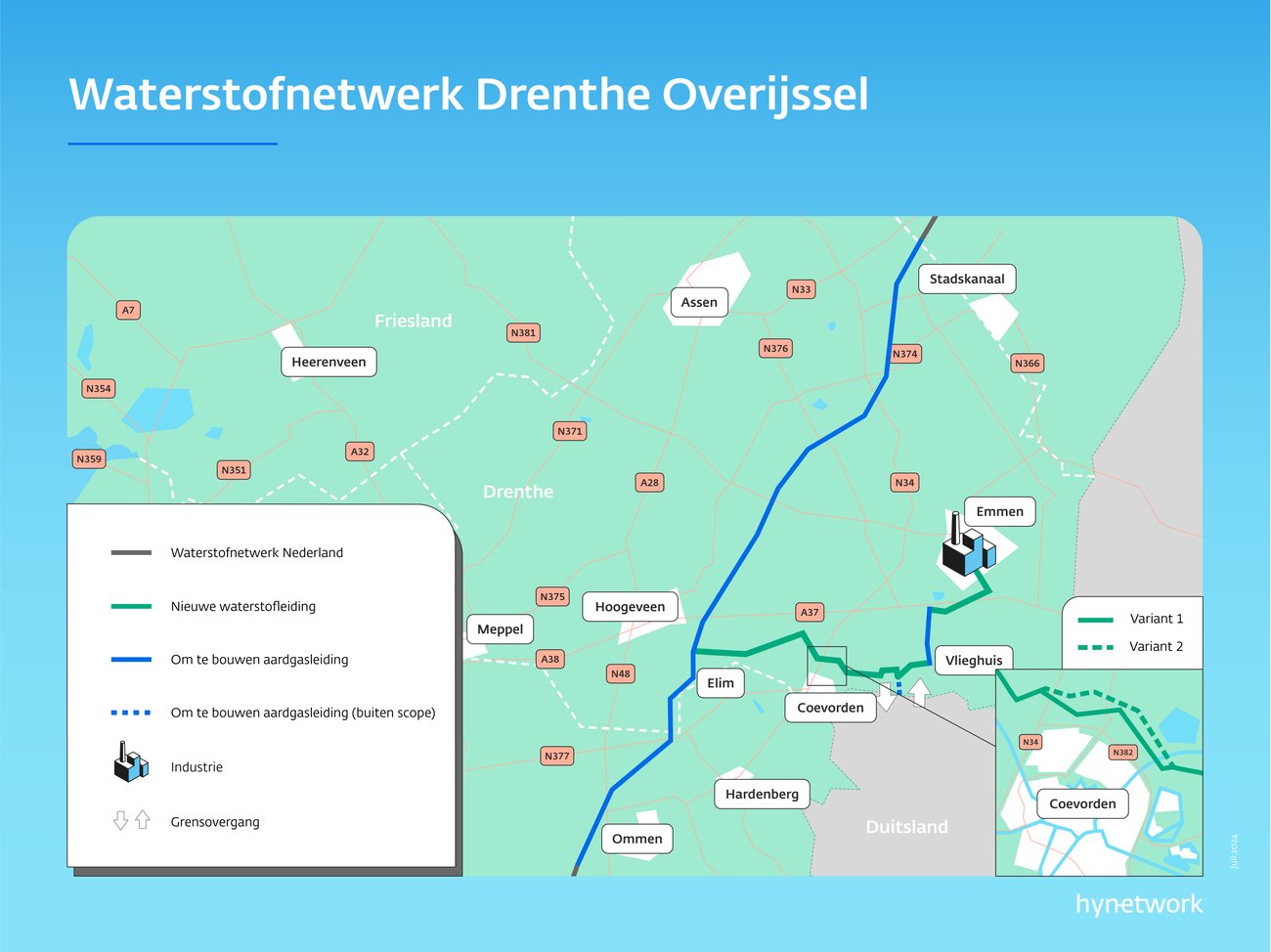 Op de route tussen Elim en Vlieghuis zijn er ten noorden van Coevorden 2 varianten voor de aanleg van de nieuwe waterstofleiding. In de NRD zijn deze varianten ook opgenomen en op het bovenstaande kaartje hebben we de twee varianten zichtbaar gemaakt.