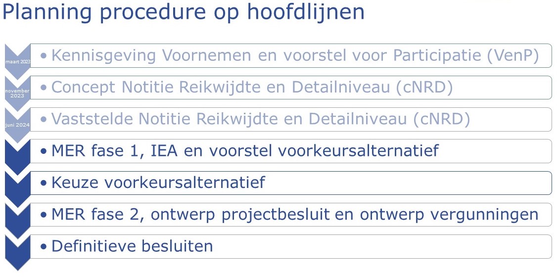 De publicatie van officiële documenten die bij de projectprocedure van Waterstofnetwerk Zuidwest-Nederland hoort, is opgeschoven naar eind 2025. Dan worden het concept-Voorkeursalternatief, de Milieueffectrapportage (MER) fase 1 en de Integrale Effectenanalyse (IEA)gepubliceerd. Dit zou eerst halverwege dit jaar zijn.