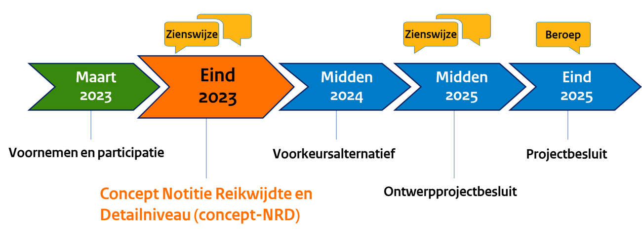 Voor dit project volgen we de procedure van de Rijkscoördinatieregeling. Een volgende stap in deze procedure is de publicatie van de conceptversie van de Notitie Reikwijdte en Detailniveau (NRD). Deze conceptversie, ook wel concept-NRD genoemd, wordt op 3 november 2023 gepubliceerd. Hierin staat een uitgebreide projectbeschrijving en wordt duidelijk welk tracé en welke milieueffecten we gaan onderzoeken in de milieueffectrapportage (MER).