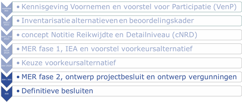 Wat: MER fase 2 is een opvolging van MER fase 1. In MER fase 1 is de impact in kaart gebracht van alle onderzochte route alternatieven. Nu er één voorkeursroute is vastgesteld zijn we ook gestart met MER fase 2: we beoordelen met deze gedetailleerde onderzoeken de gekozen voorkeursroute op verschillende milieuaspecten zoals ecologie, luchtkwaliteit, omgevingsveiligheid, water en archeologie.