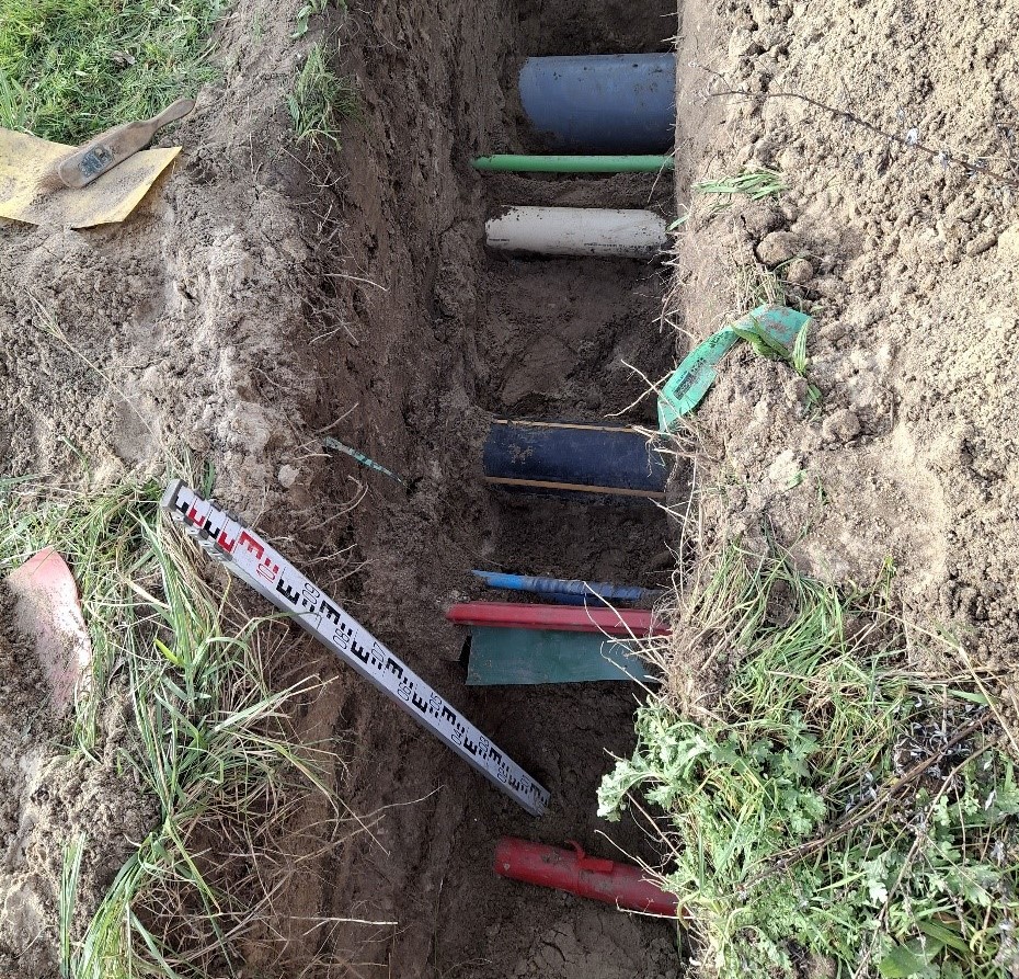 Een proefsleuf met bestaande kabels en leidingen in de grond.
