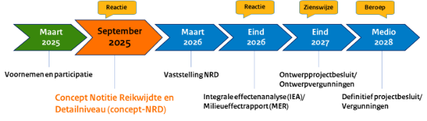 Voor dit project volgen we een vaste werkwijze, de Projectprocedure. Deze wordt aangestuurd door het Rijk en bestaat uit meerdere stappen. Een belangrijke volgende stap is het publiceren van de conceptversie van de Notitie Reikwijdte en Detailniveau (NRD). Deze concept-NRD is op 26 september 2025 openbaar gemaakt. In dit document staat uitgebreid beschreven wat het project inhoudt, welk tracé we willen onderzoeken en welke milieueffecten daarbij bekeken worden in de milieueffectrapportage (MER). Dit is een belangrijke stap om uiteindelijk tot een goed onderbouwd besluit te komen over het tracé en de uitvoering van het project.